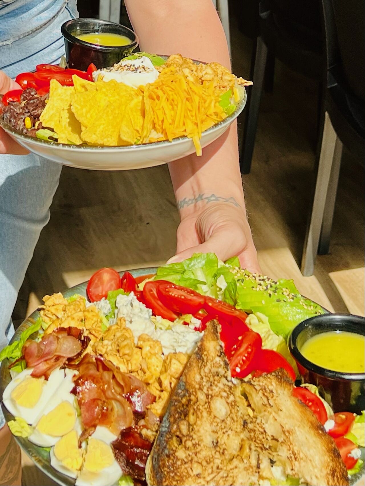 Cada plato tiene su pequeña historia. Por ejemplo, nuestras ensaladas con toques americanos nacieron de la necesidad de ofrecer algo fresco sin perder identidad. Queríamos que quien viniera a comer se sintiera saciado, pero también ligero. Por eso combinamos ingredientes locales de Sitges, como tomates y pimientos de temporada, con sabores más atrevidos como el bacon caramelizado o los jalapeños. Esta fusión refleja perfectamente nuestro estilo: americano de corazón, mediterráneo de espíritu.
